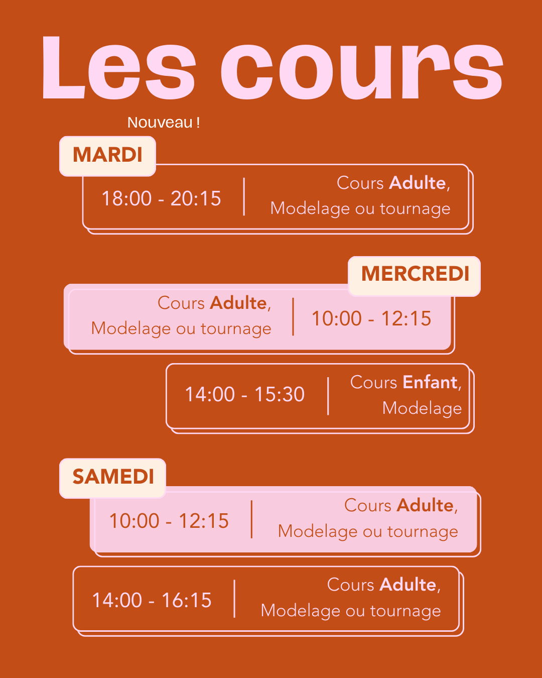 Chaque semaine, des cours de céramique y sont dispensés. Il sont accessibles pour tous, que vous soyez débutant ou plus expérimenté.